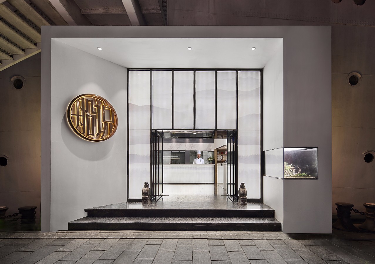 青阶白墙,山水纹氤氲缱绻,将海洋的韵致晕染开来。墙壁内嵌入的精巧景观,虚实相生,藏纳天地之灵气