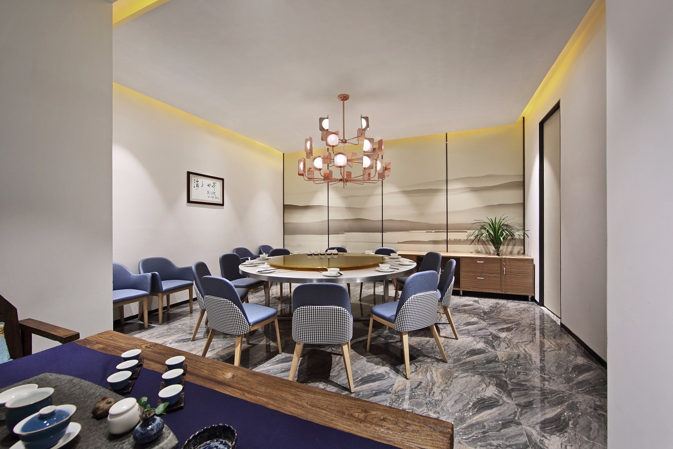 山水墙画与墨纹大理石地砖,铺陈出一幅悠然的山水画卷