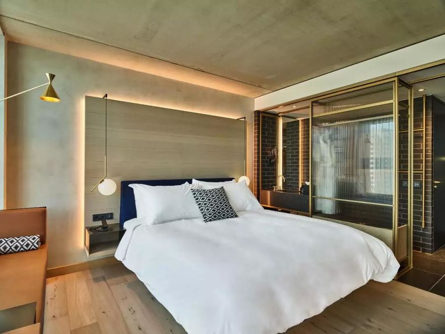 伦敦的著名设计公司Conran and Partners打造了酒店的客房,配有外露的混凝土天花板和深色砖浴室