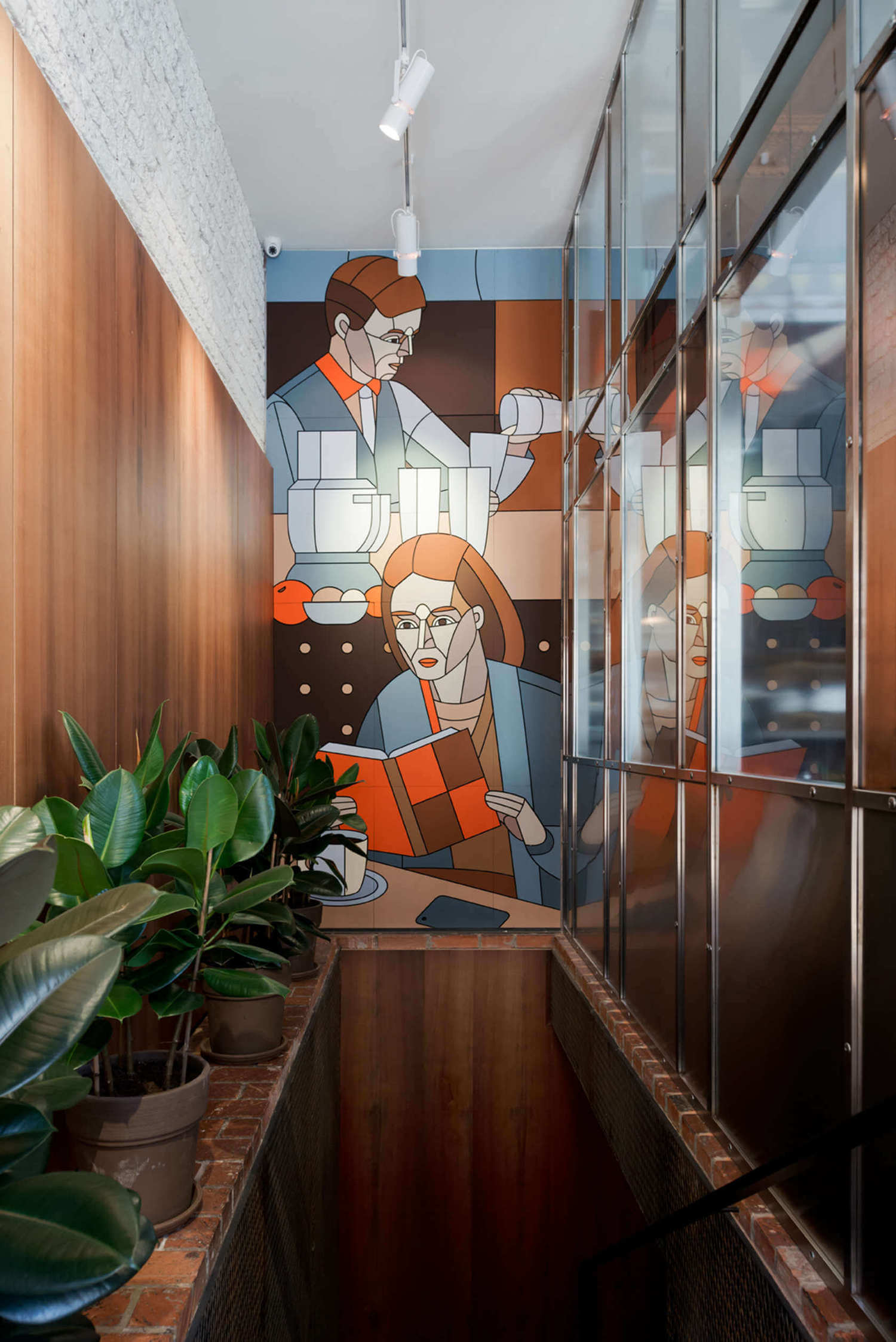 它那宏伟的面积和明亮的色彩覆盖着酒馆中央的墙壁,这种突出的风格让人们想起了苏维埃时期的餐厅,这些餐厅曾经点缀着莫斯科的街道