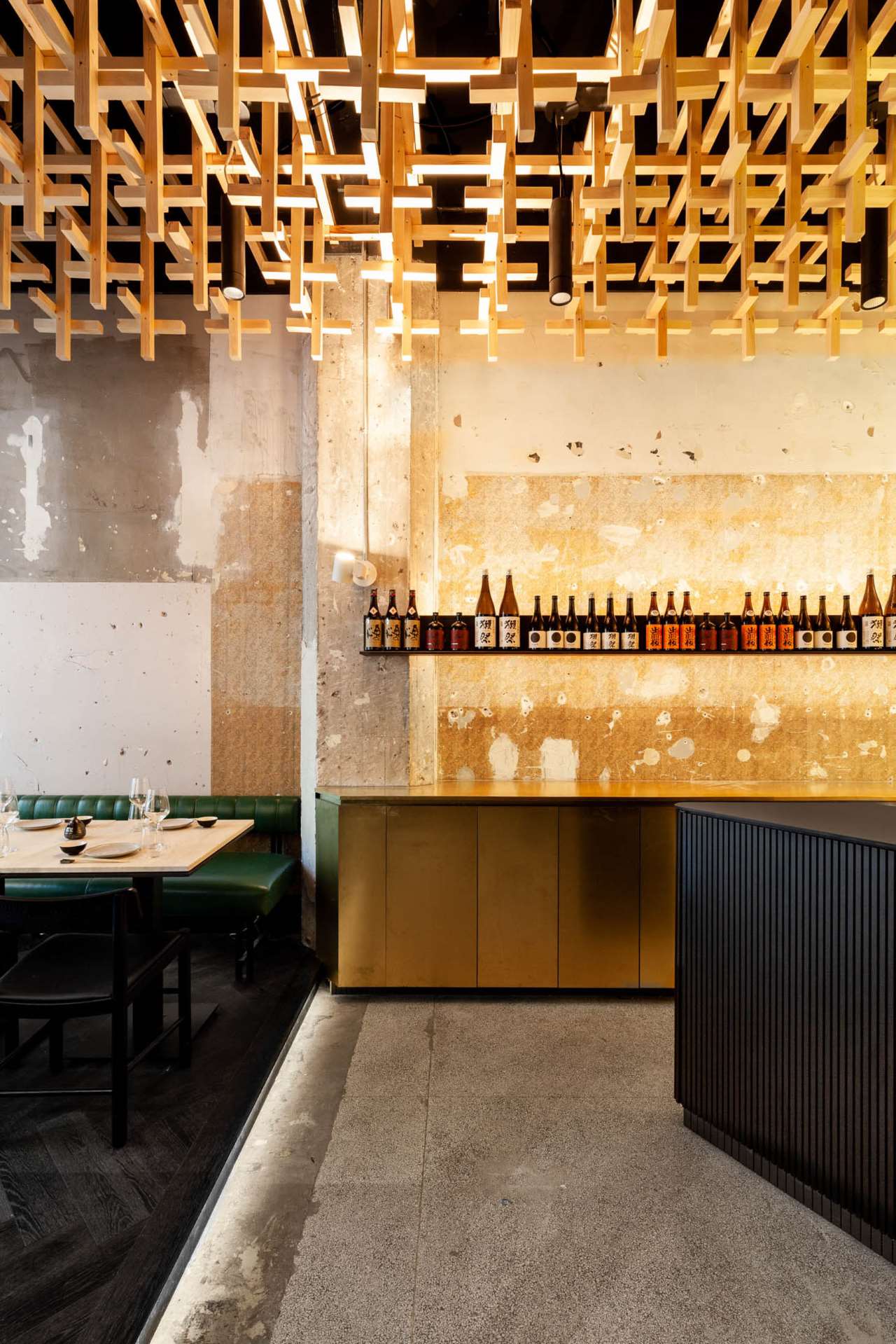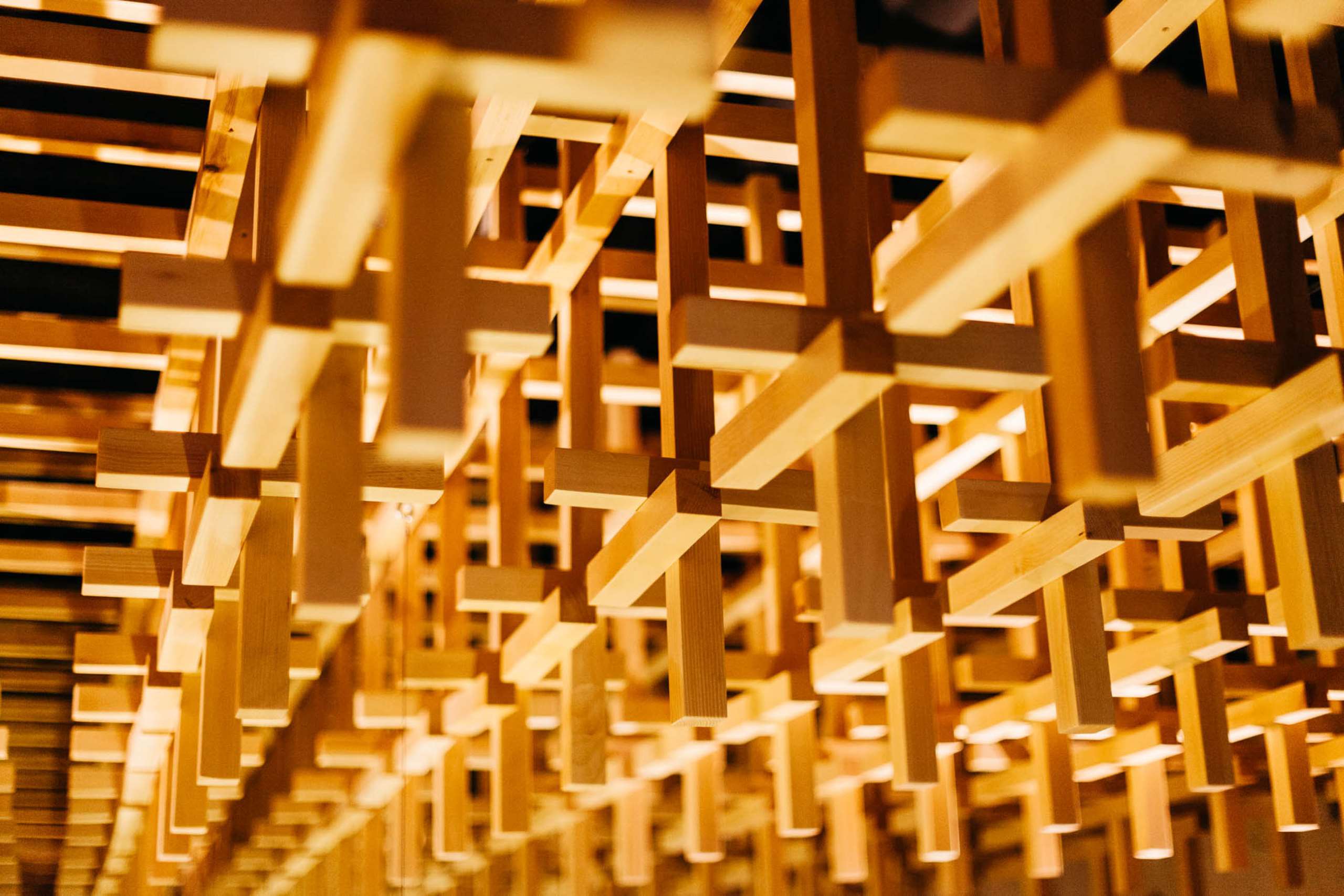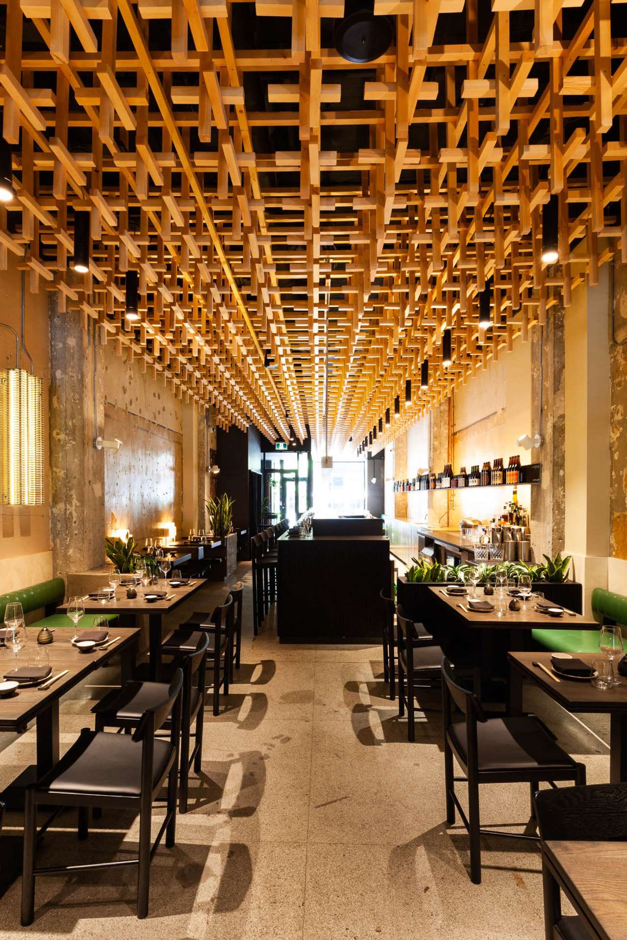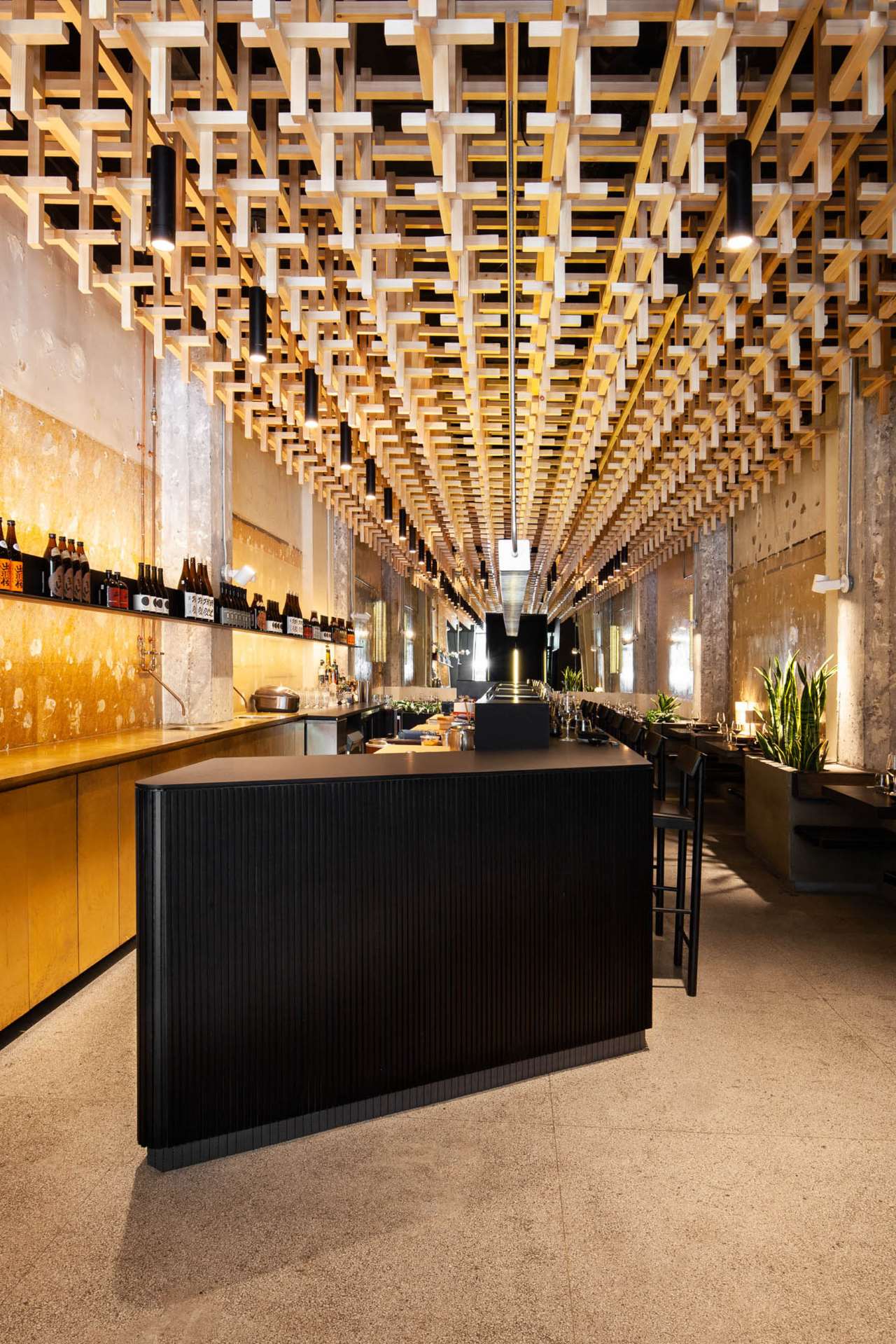 由相互连接的木质板条制成的浮动结构悬挂在天花板上,让人想起传统的日本木制品,并遮盖上面的机械管道