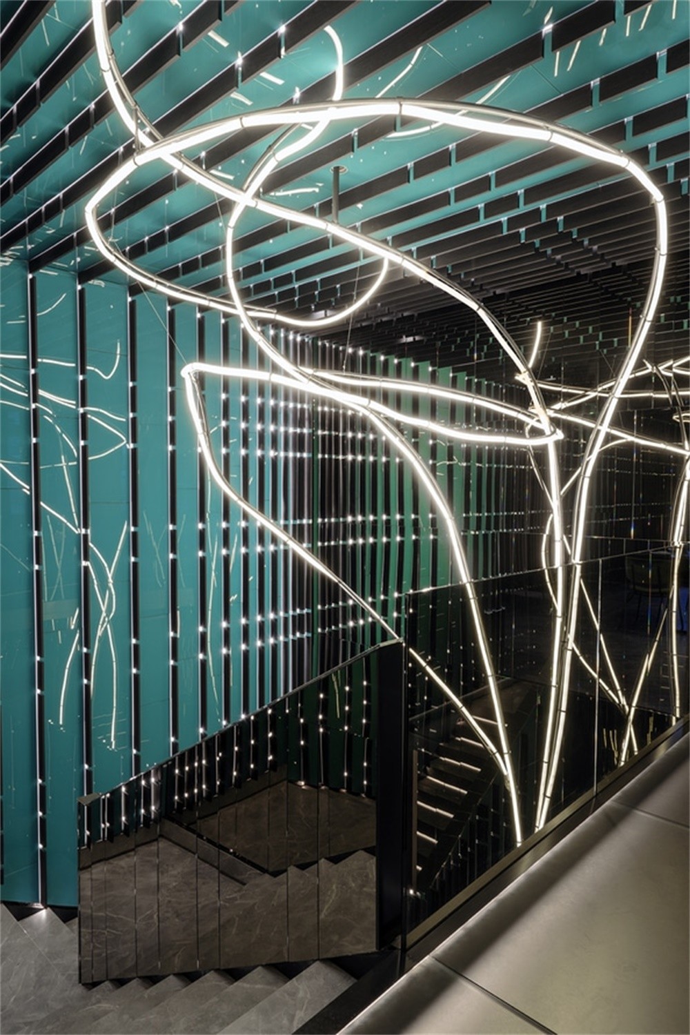 楼梯间由一面由翡翠绿色漆面和背光玻璃镶板构成的墙壁区分,并通过对密集的发光点网络的参数扫描进行装饰